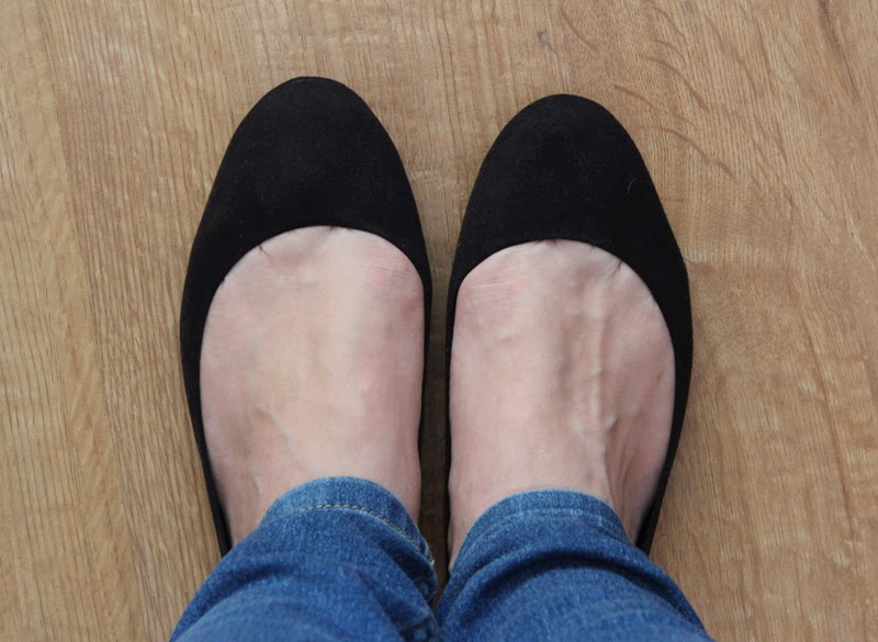 I na tym ostatnim właśnie się złapałam. Moje czarne baleriny są dość mocno wycięte i takie podobały mi się na cudzych nogach, na moich niekoniecznie. Podobno w ciąży wielu kobietom rośnie stopa i kończą z rozmiarem większym niż przed ciążą. U mnie rozmiar stopy się nie zmienił, ale niestety nie mam już tak wąskich stóp jak miałam wcześniej. W takich wyciętych balerinach wyglądam prawie, jak w płetwach… Zdjęcie ku przestrodze 🙂