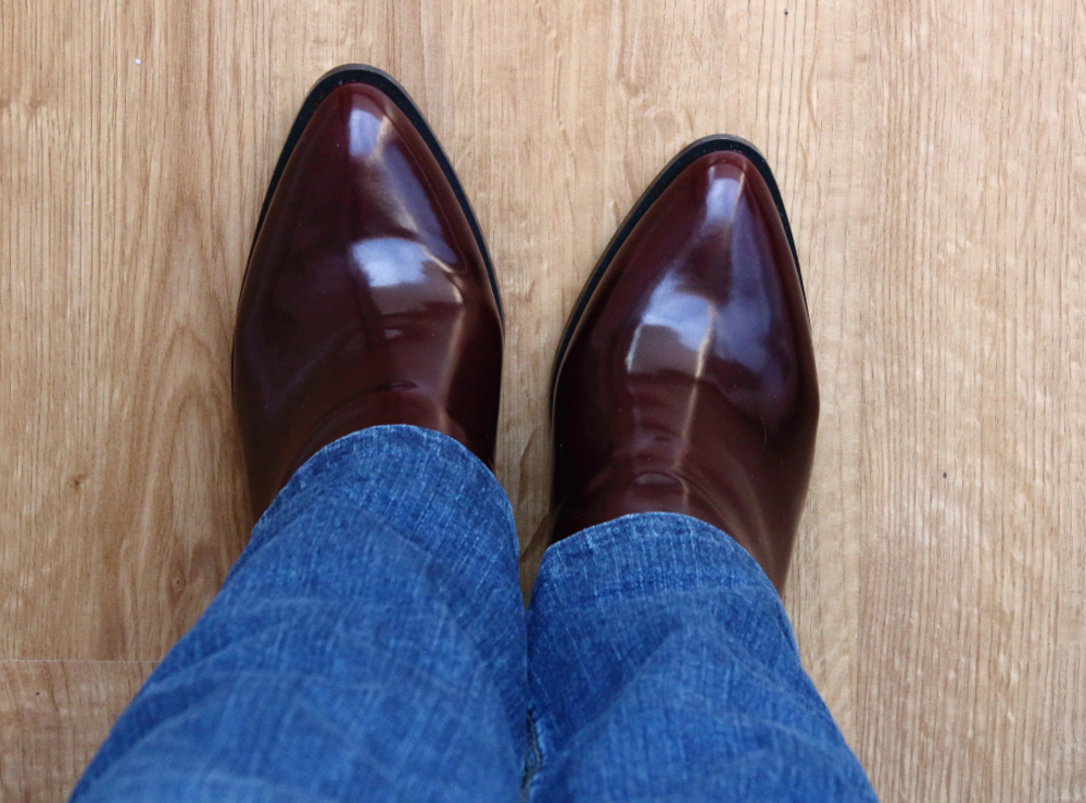 Moje botki kupiłam w C&A. Są wykonane z tworzywa sztucznego, które nieco przypomina lakierki, ale jest to coś pomiędzy matem a lakierowaną powierzchnią. Po bokach mają czarne gumki ułatwiające zakładanie, bo same w sobie są dość dopasowane. Oczywiście zamierzam nosić je wyłącznie do spodni, bo… no właśnie.