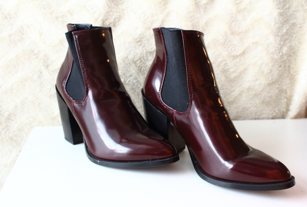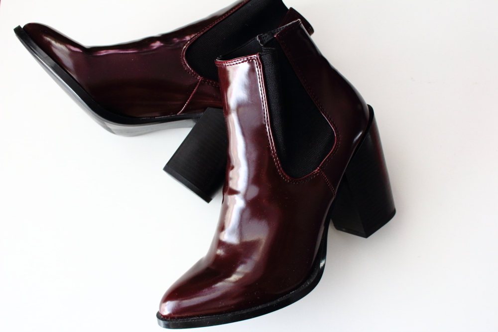 Właściwie miałam nie ulegać szaleństwu wyprzedaży i pojechałam uzupełnić szafę juniorowi. Co sezon w okresie wyprzedaży jadę, by hurtowo uzupełnić jego garderobę. Ale przechadzając się między półkami zobaczyłam te botki… Może i wykonane z tworzywa, pewnie nie będą zbyt długo służyć (choć kto wie), ale były solidnie przecenione, jedne jedyne i to w moim rozmiarze, a do tego ten kolor… Czysta marsala.