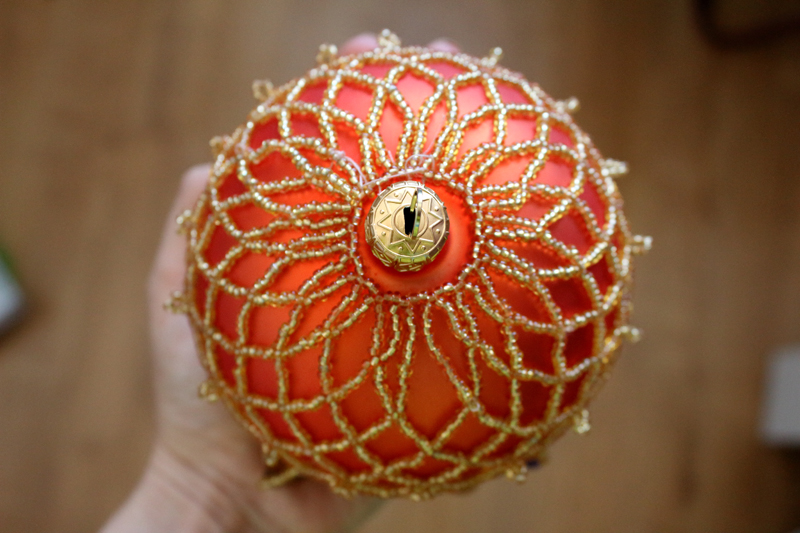 Następnie zbieramy igłą dolne koraliki i ściągamy, zamykając dół bombki. Jeśli okaże się, że dół wyszedł jednak za długi, nie ma się co przejmować – można zostawić wiszący – wygląda równie efektownie.