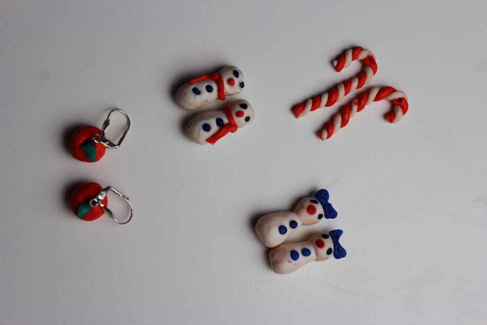 Ja podczas wspólnej zabawy z modeliną zrobiłam sobie kolczyki jabłuszka. Junior zainspirowany śniegiem za oknem zdecydował się także na stworzenie bałwanków. Do tych ostatnich muszę jednak dokupić bigle, aby móc je nosić jako kolczyki. Myślę jednak, że poczekają do następnej zimy.