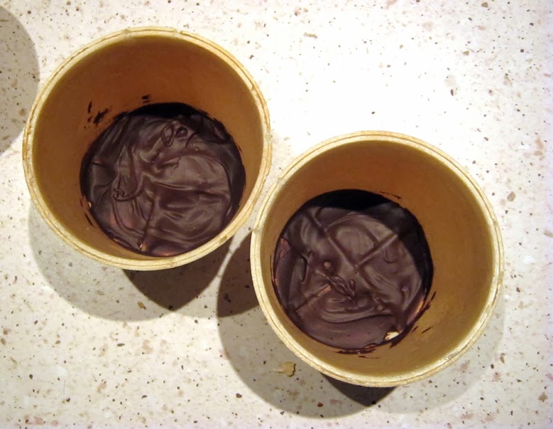 Roztapiamy 1/4 z przygotowanej czekolady do gładkości. Wkładamy po łyżce do wafelków. To ważne, bo czekolada na dnie każdego wafelka zapobiegnie wyciekaniu roztopionych lodów i zapewni dodatkowy posmak ostatnich kęsów. Wypełnione czekoladą wafelki chłodzimy, aby czekolada zastygła – ja wkładam je na chwilę do zamrażalnika.