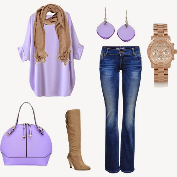 Tutaj jasny fiolet ocieplony beżem i klasyczne jeansy – prawda, że ciekawe zestawienie?