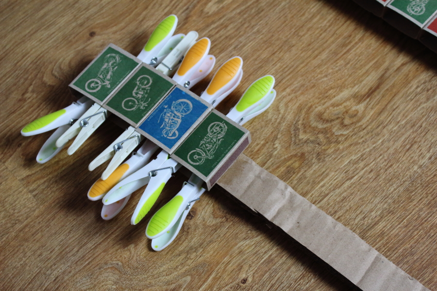 Najpierw naklejamy pudełka od zapałek na listewkę lub tekturę. Ja skleiłam ze sobą dwa paski kartonu, aby go usztywnić. Przed przyklejaniem wyjąć z pudełek „szufladki”, aby przypadkowo nam się nie skleiły. Kiedy pudełka przykleimy do listewki, mocujemy je klamerkami, aby dobrze się trzymały i pozostawiamy do wyschnięcia. Polecam klej Magic, bo dobrze trzyma i szybko schnie, a do tego po wyschnięciu robi się przezroczysty, więc nie zabrudzi nam naszej pracy.