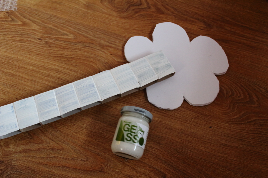 Gdy klej wyschnie, pudełka od zapałek malujemy podkładem Gesso, a następnie – gdy on wyschnie – nakładamy na nią dwie warstwy farby akrylowej. Podkład sprawi, że nie będzie prześwitywać nam obrazek znajdujący się na pudełku, a farba będzie lepiej kryła.