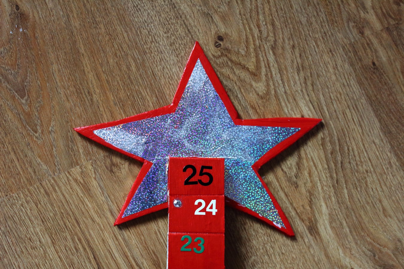 Kiedy farba wyschnie, przyklejamy na pudełka cyferki. W przypadku Bożego Narodzenia będą to cyfry 1-25 czyli odliczające czas od 1 grudnia do świąt – tyle ile zwykle ma kalendarz adwentowy. W przypadku Wielkanocy zdecydowałam się na liczbę 15, ale post ma 40 dni, więc odliczać możecie wedle uznania. Można dodatkowo ozdobić pudełka kolorowymi naklejkami. Na gwiazdę nakleiłam także dekoracyjną folię holograficzną.