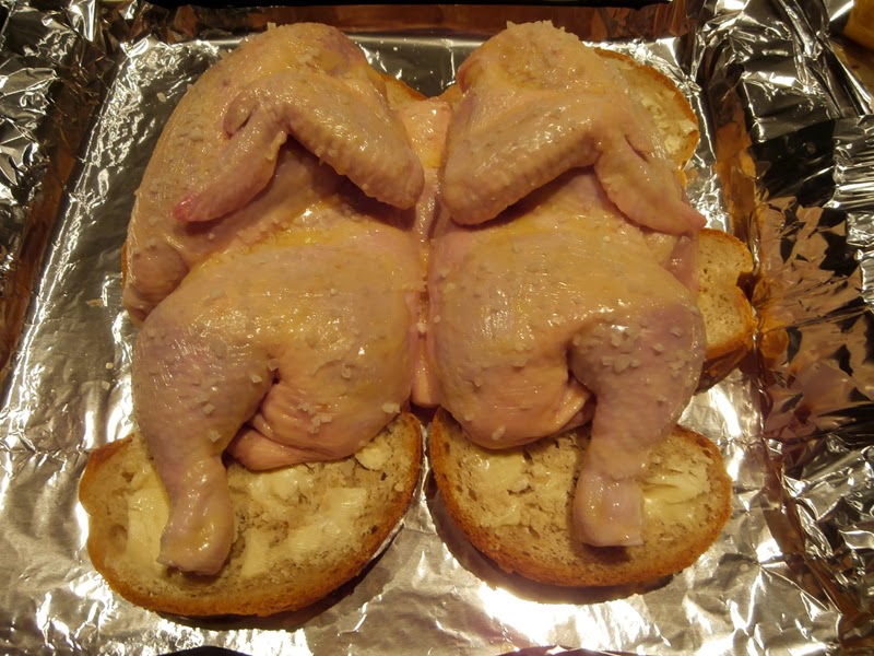 Resztą masła smarujemy kromki chleba po jednej stronie. Układamy je obok siebie, masłem do góry, na blaszce do pieczenia pokrytej folią aluminiową. Na wierzchu kładziemy kurczaka. Pieczemy go, aż będzie złocistobrązowy.