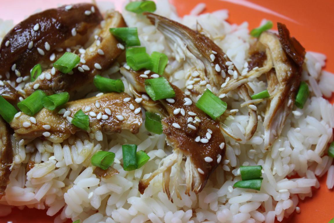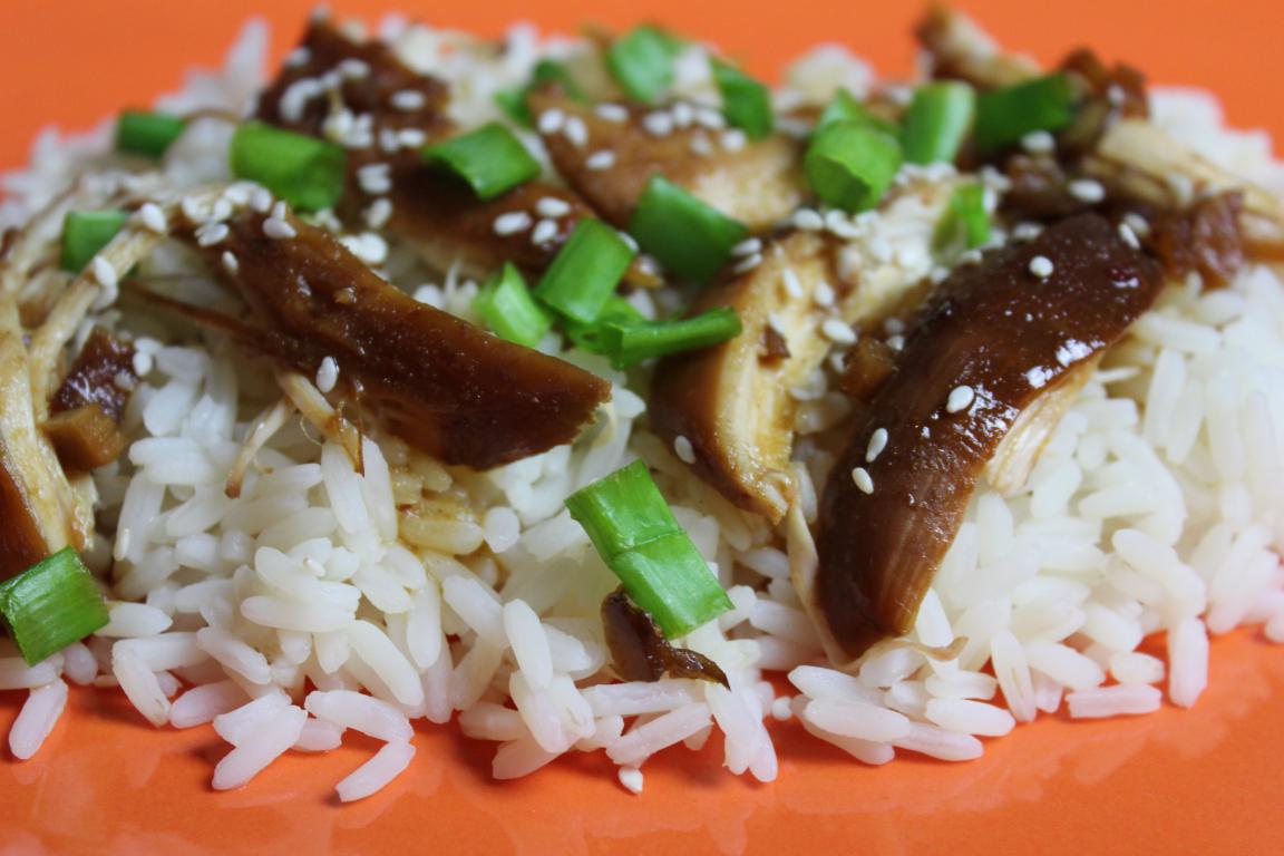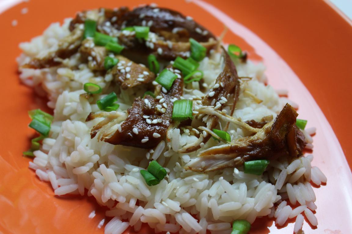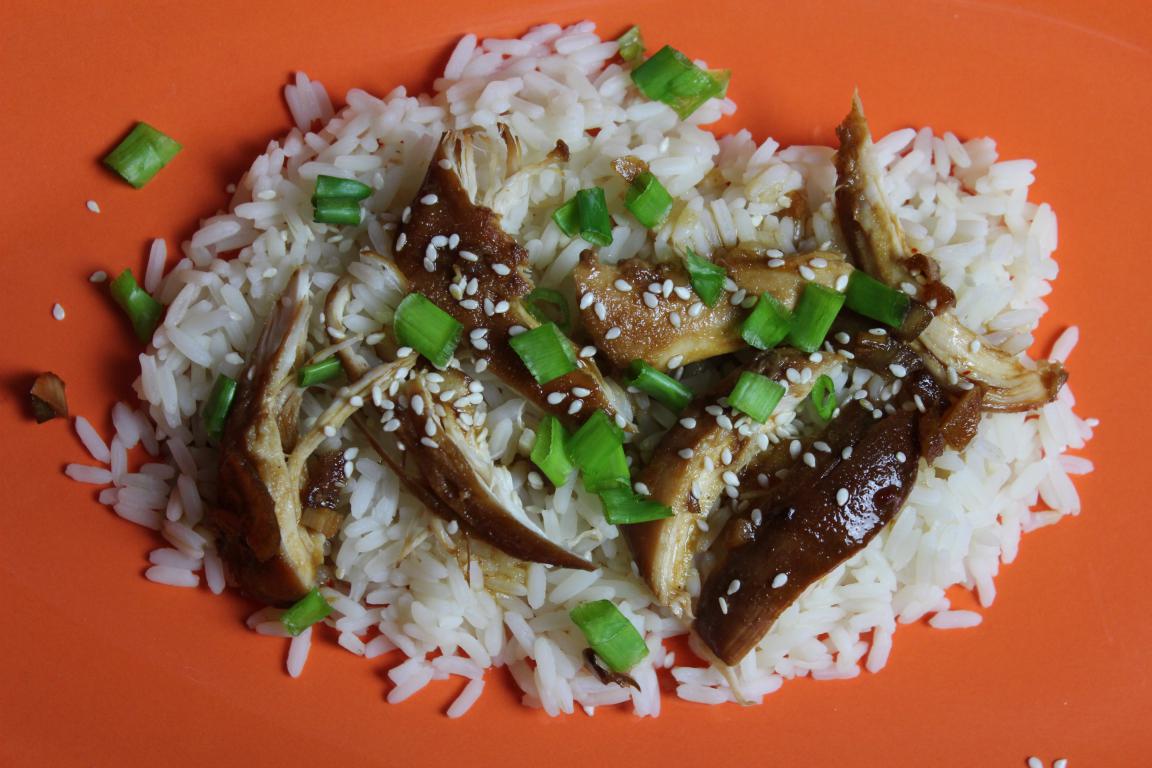 Na talerzach układamy ryż. Na wierzch układamy  mięso z kurczaka i polewamy sosem. Gotową potrawę posypujemy sezamem i szczypiorkiem. I kurczak z wolnowaru gotowy! A smak i zapach nie do opisania!
