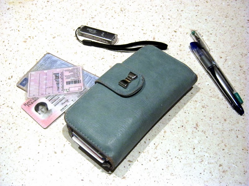 Podstawą chyba każdej torebki są portfel i dokumenty. Podobnie jest z moją. Tak jak mam dużą torebkę, tak noszę dość spory portfel, bo muszą się tam pomieścić nie tylko pieniądze, ale liczne karty rabatowe i lojalnościowe, których mam kilkanaście. Do tego pendrive, bo zawsze może się przydać i długopisy, gdyby trzeba było coś zapisać w bardziej tradycyjny sposób.