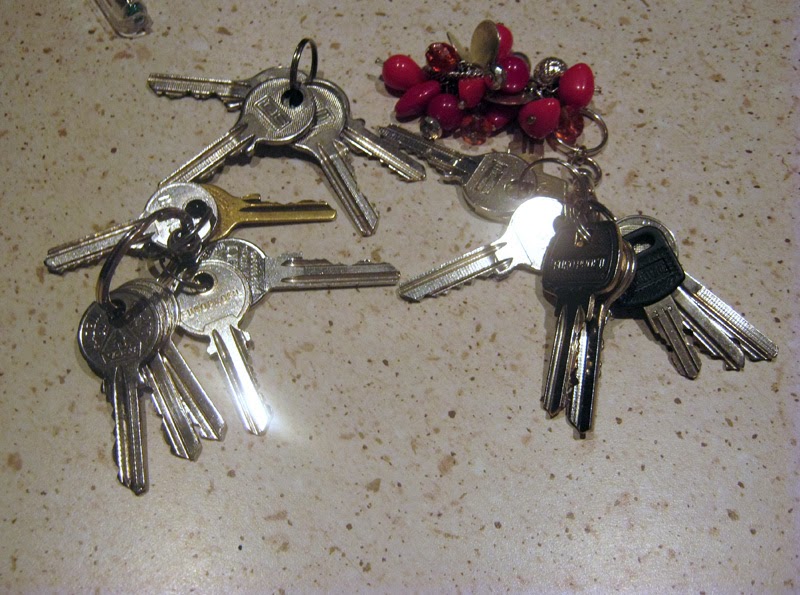 Sporo miejsca (i wagi) w mojej torebce zajmują klucze. Mam tutaj klucze do mieszkania, do pracy, do mieszkania rodziców i do mojego starego domu. Zwykle jest jeszcze kluczyk do samochodu, ale ten dziś pojechał z moim TŻ na koszykówkę.