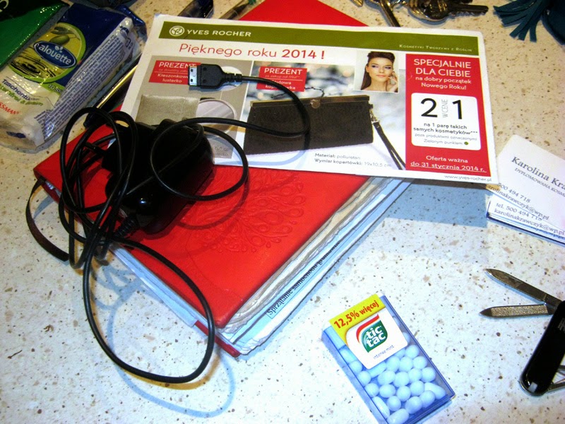 Staram się zawsze mieć przy sobie tik-taki lub gumy do żucia, które pozwalają błyskawicznie odświeżyć oddech i ładowarkę do telefonu. Noszę też aktualną ulotkę z Yves Rocher na wypadek, gdybym była w pobliżu sklepu i miała ochotę coś kupić. Sklep jest mi nie bardzo po drodze, więc noszą ją na wypadek sytuacji, gdybym przypadkowo znalazła się w pobliżu.