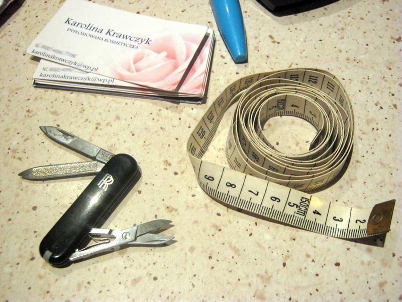 Jestem świeżo po porządkach w torebce, więc mało tutaj rzeczy nietypowych, choć zdarzało mi się już nosić śrubokręt, młotek czy inne niekoniecznie kobiece przedmioty. Do podręcznych rzeczy, których nigdy nie wypakowuję należą jednak także centymetr krawiecki, scyzoryk oraz moje wizytówki, które również plątają się luzem po mojej torebce – może w końcu dorobię się wizytownika.