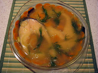 Muszę przyznać, że nigdy nie zajadałam się rybami, a już zupełnie nie dostrzegałam różnicy między nimi. Do czasu ciąży. W ciąży pan doktor i położna kazali mi jeść dużo ryb, więc jadłam, próbowałam i wyrobiłam sobie swoje rybne gusta. Dziś jednak chciałam zaproponować łososia, którego w sumie trudno jest nie lubić, podanego jednak nieco niestandardowo, bo w galarecie. Choć większości z nas kojarzy się on z bardzo chudą rybą (pewnie dlatego, że zazwyczaj kupujemy filety), jest to jedna z najtłustszych ryb morskich, a zawarte w jego mięsie kwasy omega-3 i omega-6 są bezcenne dla naszego zdrowia. Galareta z dodatkiem białego wina nadaje rybie dodatkowo ciekawy smak.