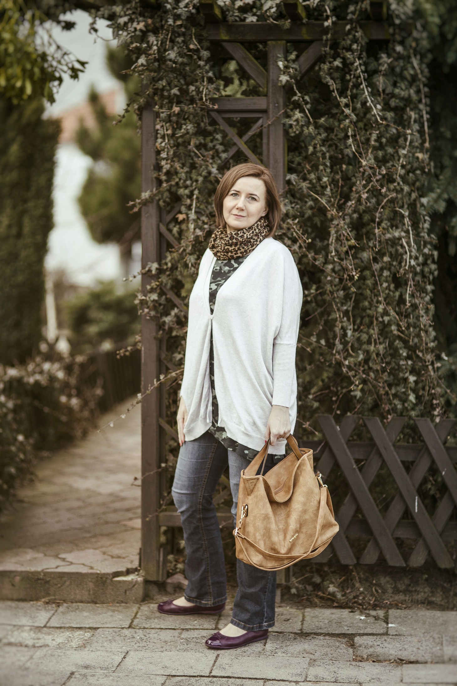 Dołożyłam do niej nieśmiertelne dżinsy – tym razem w ciemniejszym odcieniu oraz rozpinany beżowy kardigan z Zary trochę w kroju nietoperza (tak, do nietypowych krojów mam lekką słabość). Jako, że miało być wygodnie i komfortowo, w sam raz dla młodej mamy, całość uzupełniłam balerinami oraz dużą, pakowną torebką. Część ciuchów pewnie już znacie z poprzednich stylizacji, ale staram się tak komponować moje zestawy, aby jeden ciuch był nowy, a pozostałe pochodziły wprost z mojej szafy.